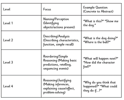 Children are first supported to understand concrete information through Level 1 and Level 2 questions, which focus on identifying, naming, describing, and recalling key facts directly from the text or images. Once children are secure at this stage, they are guided towards Level 3 and Level 4 questions, which encourage them to think more deeply by making inferences, predicting outcomes, explaining reasons, and applying understanding beyond the text.